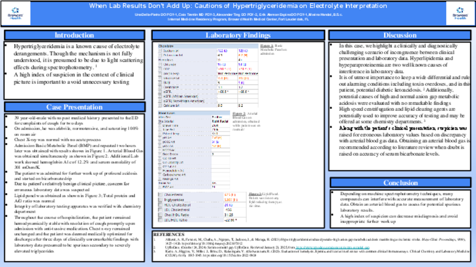 Case Presentation: A 39 year-old-male with no past medical history presented to the ED for complaints of cough for two days. On admission, he was afebrile, normotensive, and saturating 100% on room air. Chest X-ray was normal with no acute process. Admission Basic Metabolic Panel (BMP) and repeated two hours later and showed a severe metabolic acidosis, hyponatremia, and hypochloremia. Arterial Blood Gas was obtained and showed an incongruent mild respiratory alkalosis metabolic with secondary metabolic acidosis. Additional Lab work showed hemoglobin A1c of 12.2% and serum osmolality of 301 mOsm/K. The patient was admitted for further work up of profound acidosis and started on bicarbonate drip. Due to patient’s relatively benign clinical picture, concern for erroneous laboratory data was suspected. Lipid panel was obtained with triglycerides found to be 5307; Total protein and A/G ratio was normal. Integrity of laboratory testing apparatus was verified with chemistry department. Throughout the course of hospitalization, the patient remained hemodynamically stable with resolution of cough promptly upon admission with anti-tussive medication. Chest x-ray remained unchanged and the patient was deemed medically optimized for discharge after three days of clinically unremarkable findings with laboratory data presumed to be spurious secondary to severely elevated triglycerides.